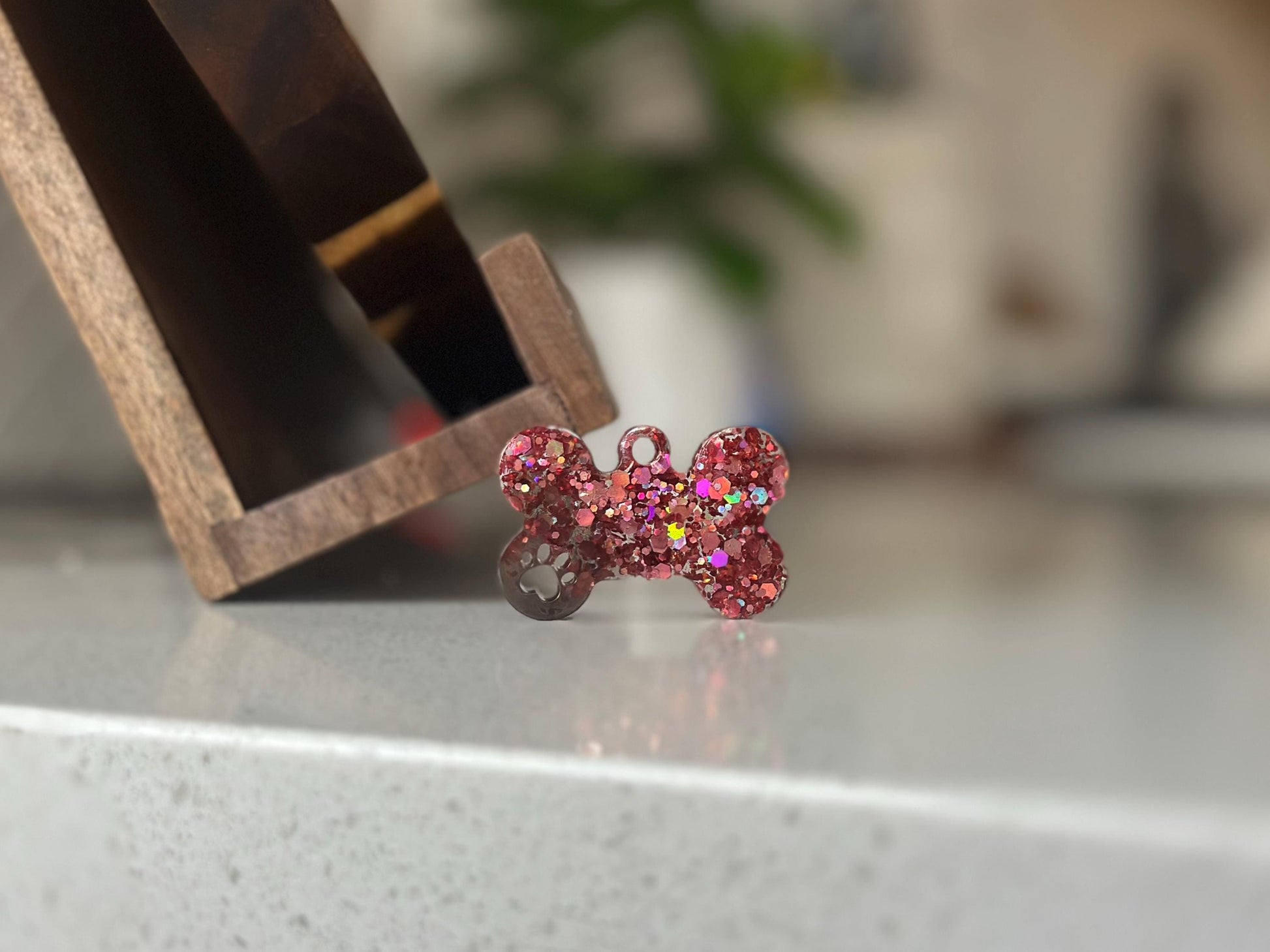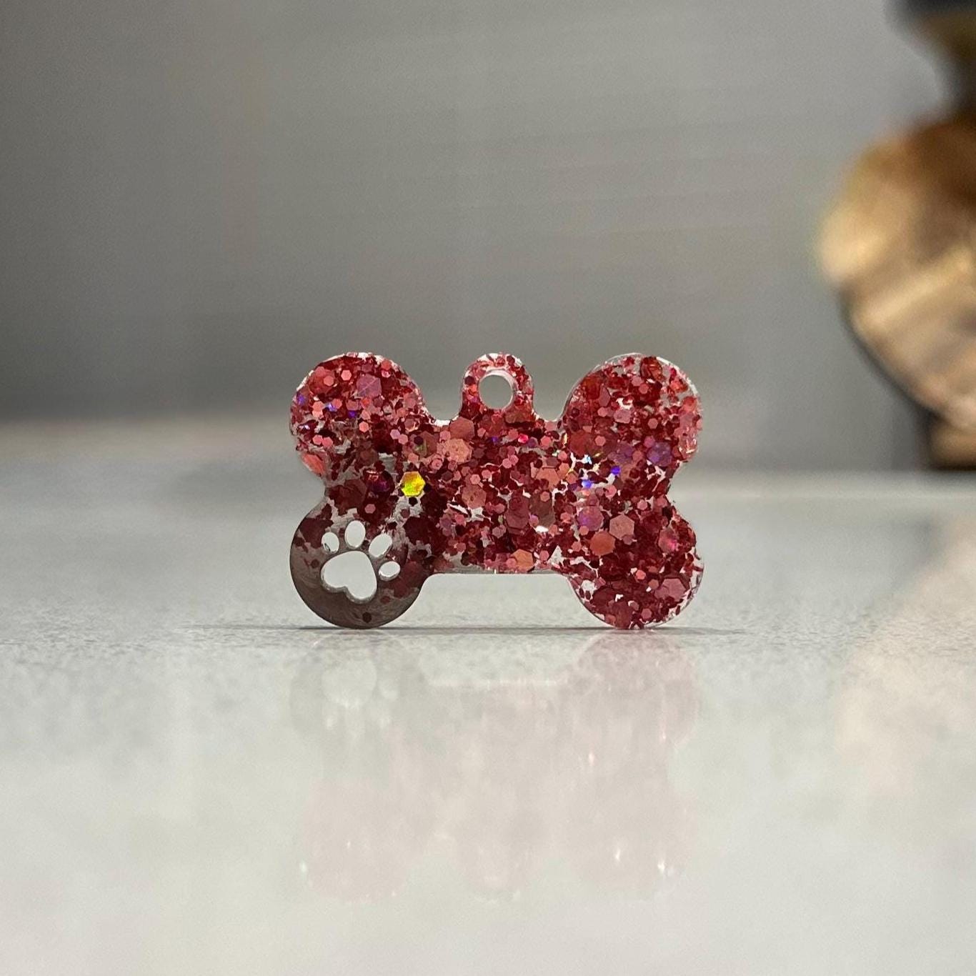 Add a bold pop of color to your pup’s look with this handmade glitter resin dog bone tag in vibrant red! Featuring dazzling sparkle and a sweet paw print cutout, this tag combines personality and practicality – perfect for stylish pets and their proud owners.